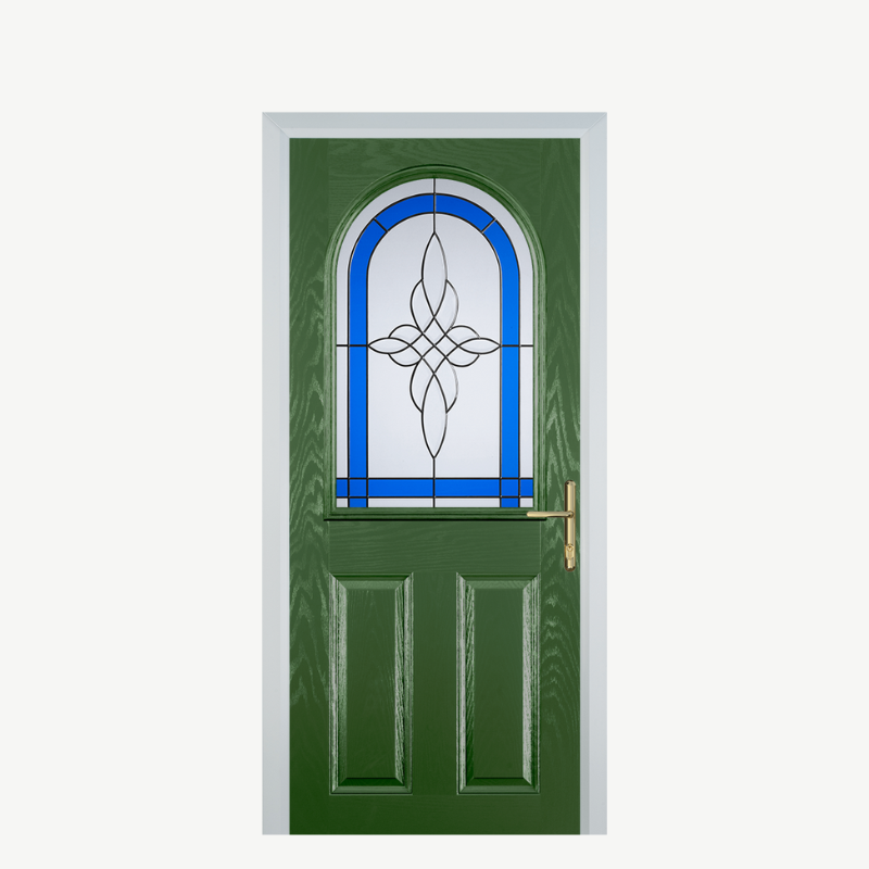 Introducing the Door E 2 Panel 1 Arch in a stunning Fern Green with Crystal Harmony Blue accents, the perfect choice for those looking to elevate their home's entrance. This exquisite composite front door blends style and durability, making a striking first impression while providing essential security and insulation.