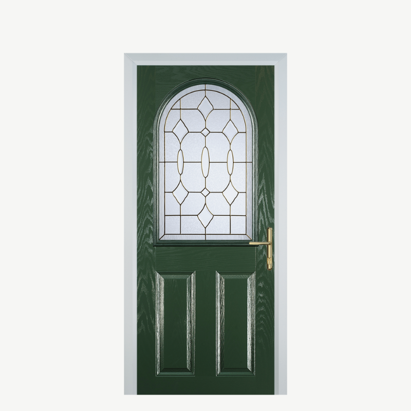 Constructed from premium composite materials, this door requires minimal upkeep—simply wipe down with a damp cloth to keep it looking fresh. Elevate your entryway with the Door E 2 Panel 1 Arch Green Brass Art Clarity, the perfect blend of style and practicality.