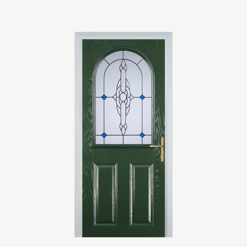 Introducing the Door E 2 Panel 1 Arch in Green Crystal Bohemia Blue, an exquisite addition to your home that seamlessly combines elegance and durability. This composite front door is designed to enhance your entryway while providing a secure barrier against the elements.