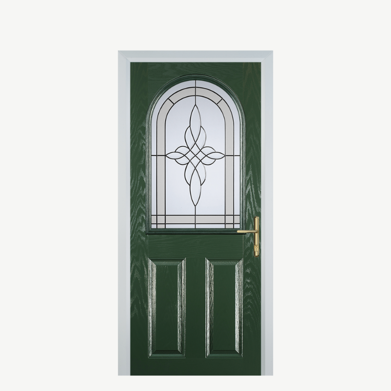 Introducing the Door E 2 Panel 1 Arch Green Crystal Harmony Frost, a stunning addition to any home that not only enhances curb appeal but also provides exceptional functionality. This beautifully designed composite front door combines elegance with durability, making it an ideal choice for homeowners seeking quality and style.