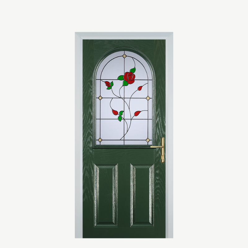 Introducing the Door E 2 Panel 1 Arch Green English Rose, a stunning addition to your home's entrance that blends classic elegance with modern durability. This composite front door not only enhances your home's curb appeal but also provides exceptional security and insulation.