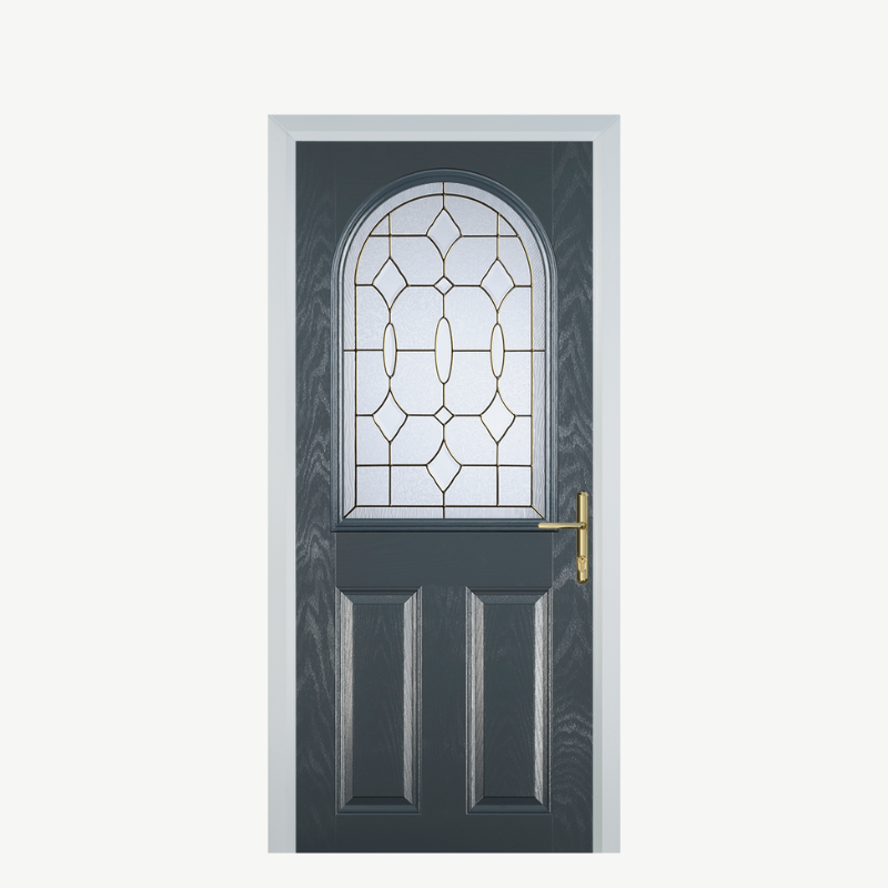 Introducing the Door E 2 Panel 1 Arch in Grey with Brass Art Clarity, a stunning addition to your home that effortlessly combines elegance with functionality. This composite front door is designed to enhance your entrance while providing superior insulation and security.