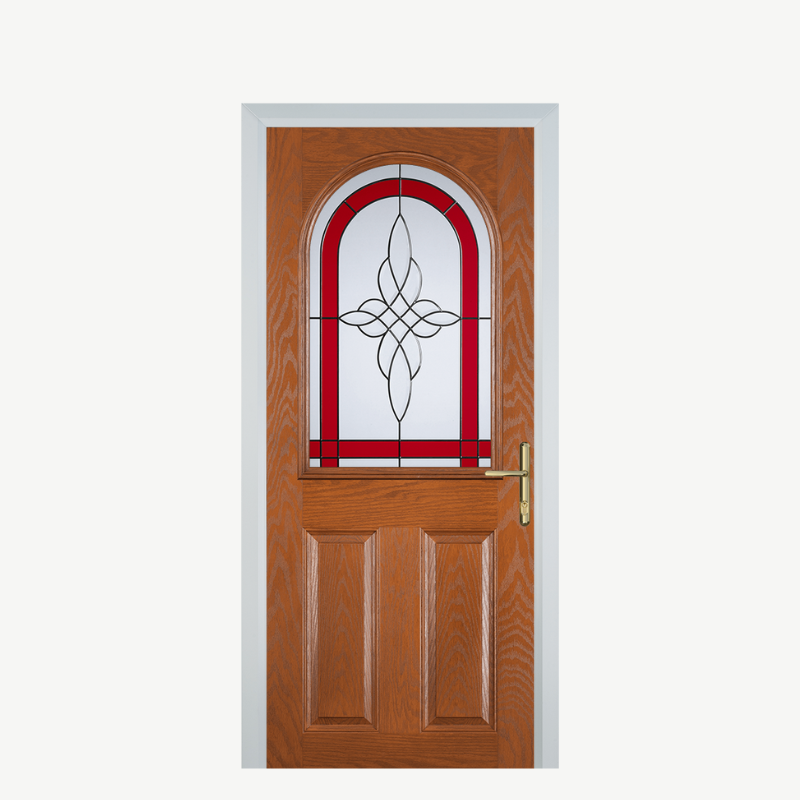 Introducing the Door E 2 Panel 1 Arch Oak Crystal Harmony Red, a stunning addition to any home that seamlessly combines style, security, and durability. This beautifully designed composite front door is perfect for those looking to enhance their entryway with a touch of elegance while ensuring robust protection.