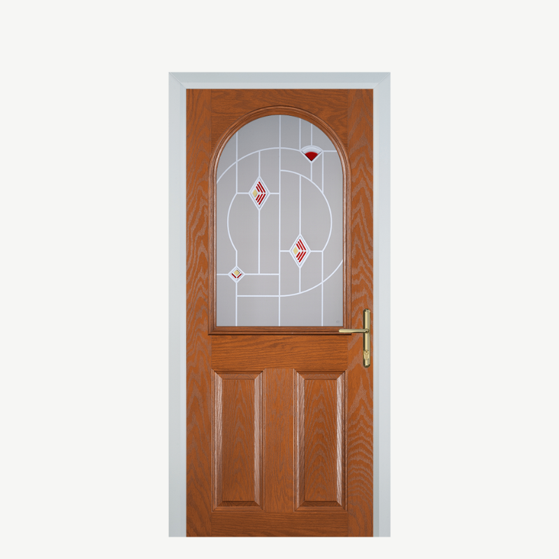 Introducing the Door E 2 Panel 1 Arch Oak Murano Red, a striking addition to your home that seamlessly combines style and functionality. This composite front door is designed to make a bold statement while providing durability and security.
