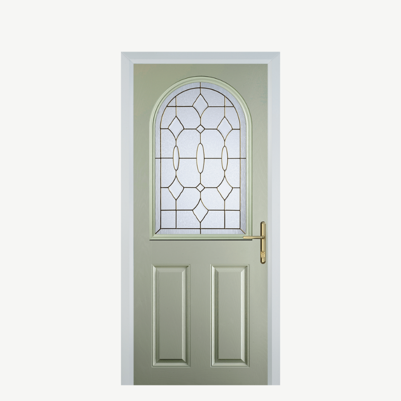 Introducing the Door E 2 Panel 1 Arch in Pebble Grey with Brass Art Clarity, a perfect blend of style, durability, and security for any home. This composite front door not only enhances your property's curb appeal but also provides exceptional performance and longevity.