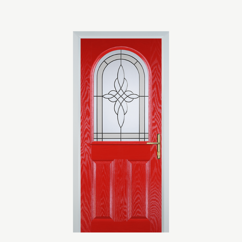 Introducing the Door E 2 Panel 1 Arch in a striking Poppy Red (High Gloss) finish. This stunning composite front door combines elegance and durability, making it the perfect choice for enhancing your home's entrance while providing superior security and insulation.