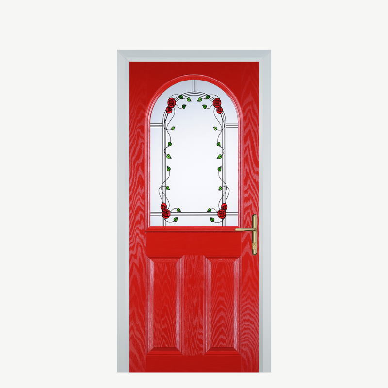 Introducing the Door E 2 Panel 1 Arch in a stunning Poppy Red (High Gloss) finish, designed to elevate the entrance of your home with elegance and style. This composite front door effortlessly combines modern aesthetics with traditional craftsmanship, making it a perfect choice for those looking to enhance their curb appeal.