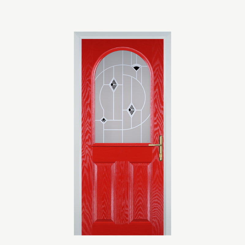 Introducing the Door E 2 Panel 1 Arch in a striking Poppy Red (High Gloss) finish, complemented by the elegant Murano Black accents. This composite front door is designed to make a bold statement while providing exceptional durability and security for your home. Perfectly suited for modern and traditional residences alike, it enhances curb appeal and welcomes guests with style.