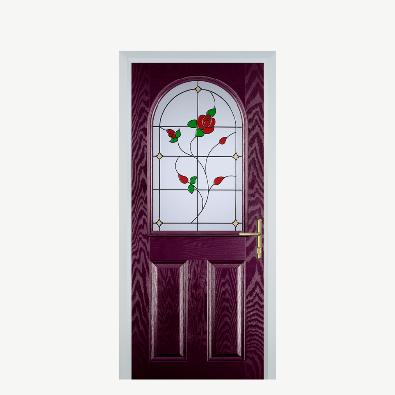 Introducing the Door E 2 Panel 1 Arch in a stunning Purple Violet finish, designed to make a striking statement at the entrance of your home. This composite front door combines aesthetic appeal with exceptional durability, ensuring your entryway is both beautiful and secure.