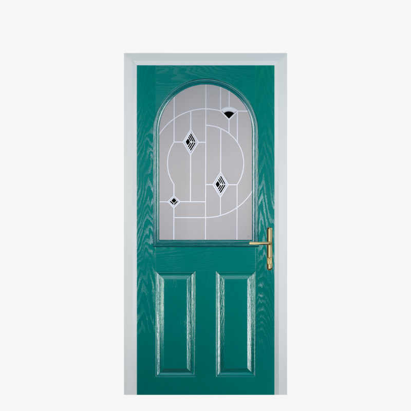 Introducing the Door E 2 Panel 1 Arch in a stunning Turquoise Blue Murano Black finish, the perfect blend of style and functionality for your entrance. This door is designed to elevate the aesthetic of your home while providing superior security and durability.