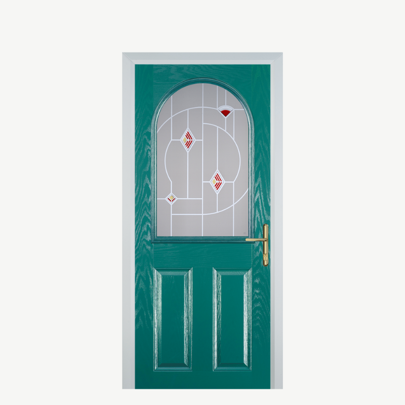 Introducing the Door E 2 Panel 1 Arch in a striking Turquoise Blue with Murano Red accents, the perfect blend of modern design and vibrant color to enhance any entrance. This composite front door not only provides exceptional security but also makes a bold statement, making it an ideal choice for homeowners seeking both style and functionality.