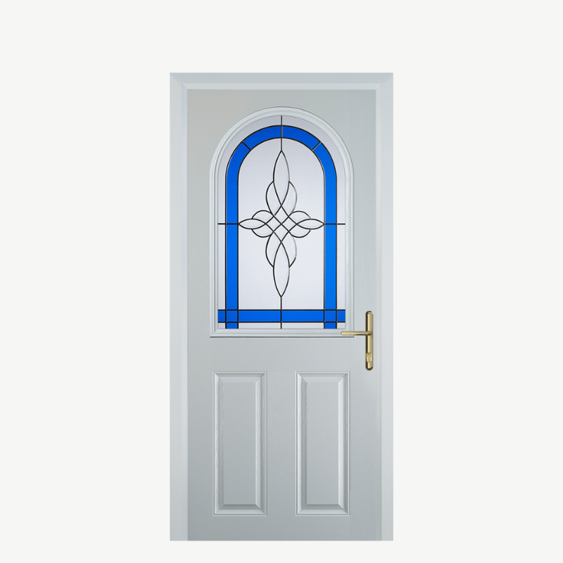 Introducing the Door E 2 Panel 1 Arch White Crystal Harmony Blue, a stunning addition to any home that combines elegance with functionality. This beautifully designed composite front door not only enhances your curb appeal but also provides exceptional durability and security for your entryway.