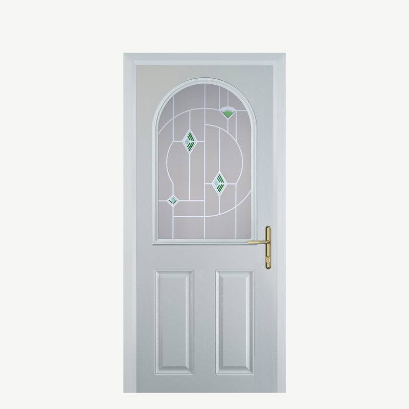 Introducing the Door E 2 Panel 1 Arch in a striking White Murano Green finish, designed to elevate the entrance of your home. This composite front door combines functionality with aesthetic appeal, offering a perfect blend of style and security.