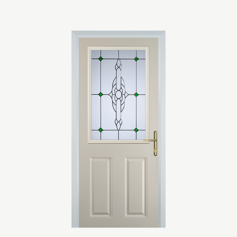 Introducing the Door F 2 Panel 1 Square Cream Crystal Bohemia Green, a stunning addition to any home that seamlessly combines style and functionality. Designed to elevate your entryway, this composite front door not only enhances your property's curb appeal but also provides exceptional durability and security.