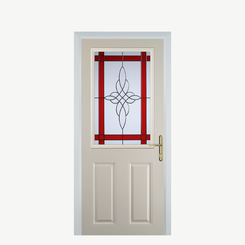 Introducing the Door F 2 Panel 1 Square in Cream Crystal Harmony Red, a stunning addition to any home that combines style and functionality. This beautifully designed composite front door not only enhances your home's curb appeal but also ensures durability and security.