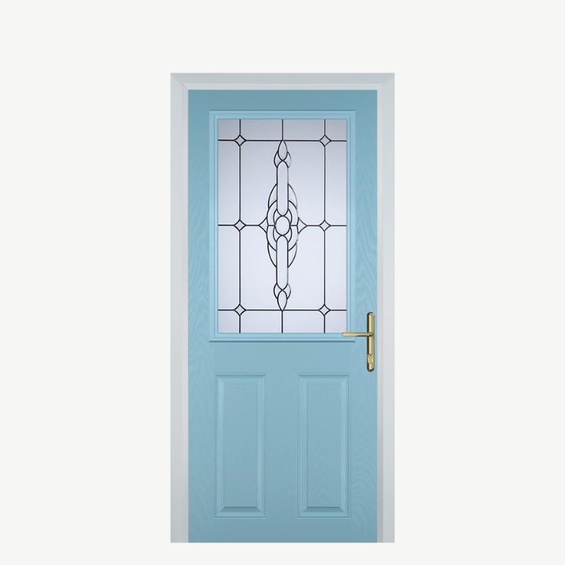 Introducing the Door F 2 Panel 1 Square in a stunning Duck Egg Blue with a Crystal Bohemia Frost finish, the perfect addition to enhance your home's entrance. This exquisite composite front door combines style with practicality, offering a contemporary aesthetic that makes a lasting impression.