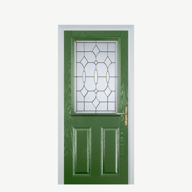 Introducing the Door F 2 Panel 1 Square in a stunning Fern Green finish, designed to elevate the aesthetic of your home while providing exceptional security and durability. This composite front door combines elegance with functionality, making it an ideal choice for those looking to enhance their entryway with a touch of sophistication.