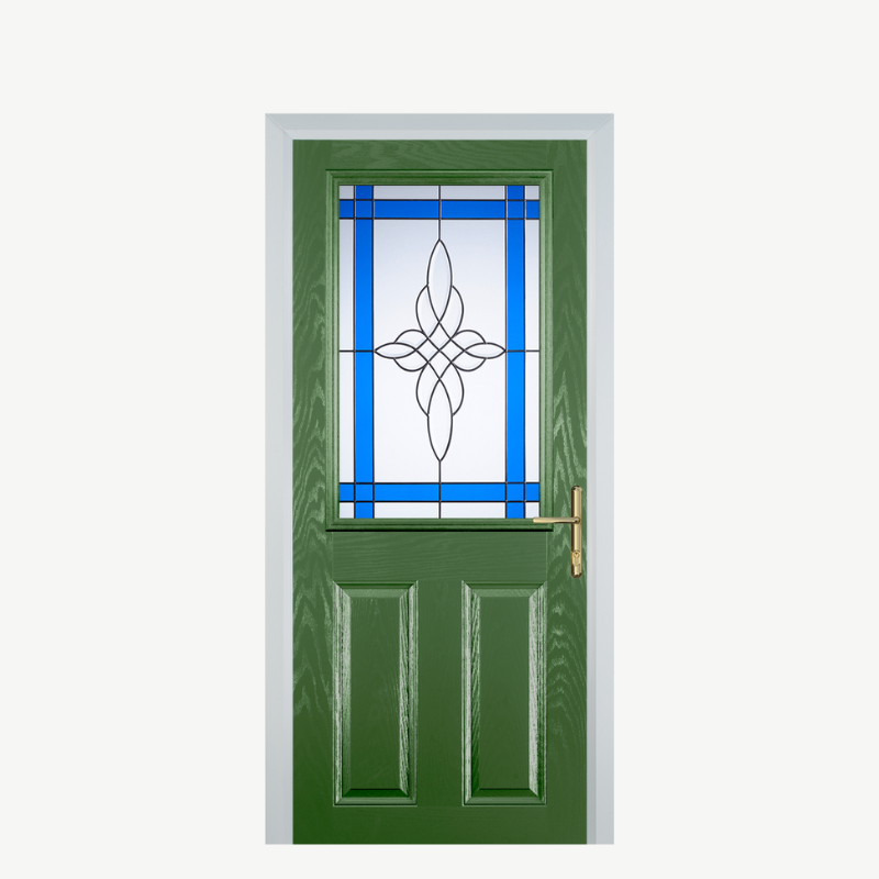 Introducing the Door F 2 Panel 1 Square in Fern Green with Crystal Harmony Blue accents, a stunning addition to any property that combines elegance with functionality. This composite front door is designed to enhance your home's curb appeal while providing security and durability.