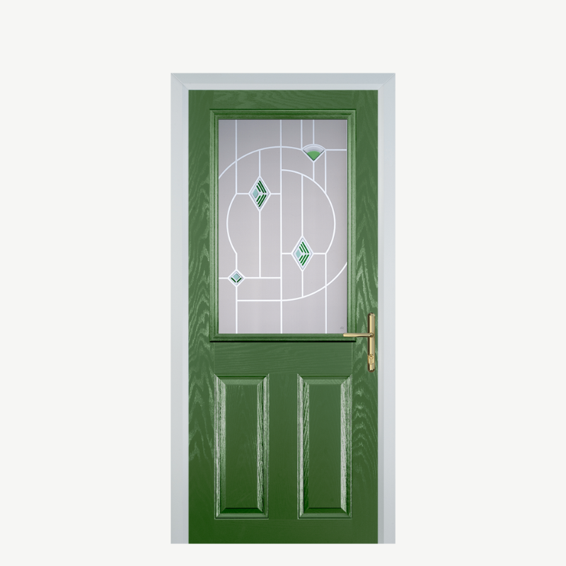 Introducing the "Door F 2 Panel 1 Square Fern Green Murano Green," a stunning composite front door that effortlessly combines elegance and security. Designed to enhance the curb appeal of any home, this door not only serves as a stylish entry point but also offers superior durability and insulation.