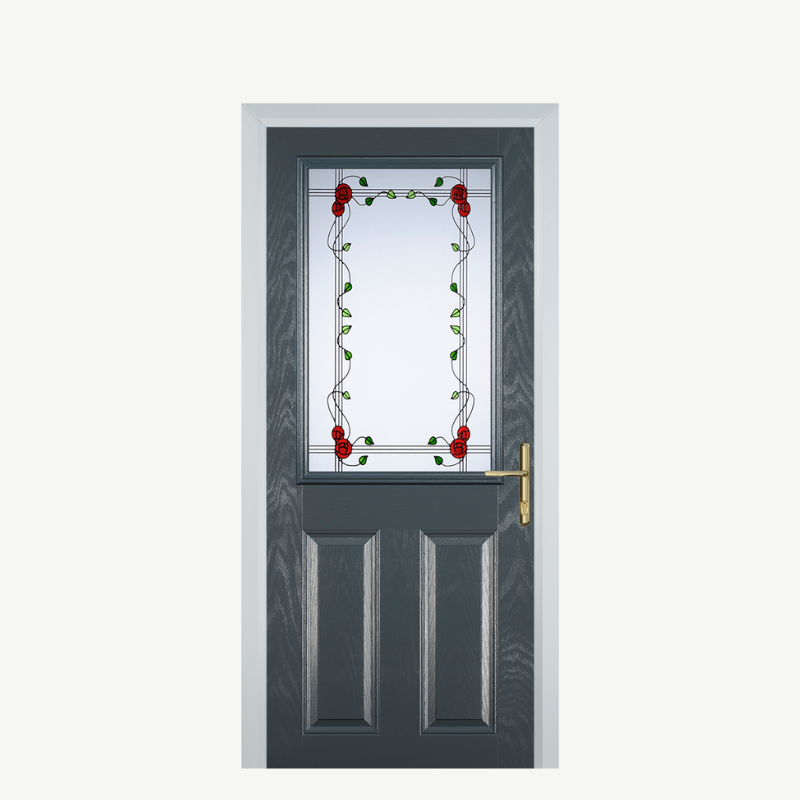 Introducing the Door F 2 Panel 1 Square Grey Mackintosh Rose, an exquisite addition to your home that blends elegance with modern functionality. This composite front door not only enhances your property's curb appeal but also provides durability and security, making it the perfect choice for any homeowner seeking style and substance.