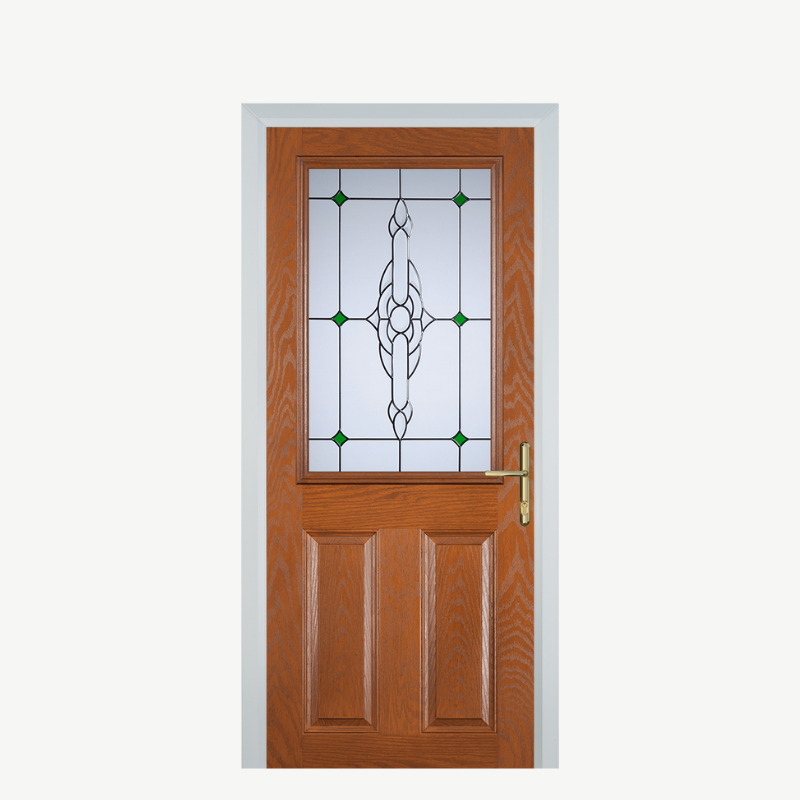 Introducing the Door F 2 Panel 1 Square Oak Crystal Bohemia Green, a stunning composite front door that effortlessly combines aesthetic appeal and durability. Designed to make a lasting impression, this door serves as a perfect focal point for any home entrance, enhancing both security and style.