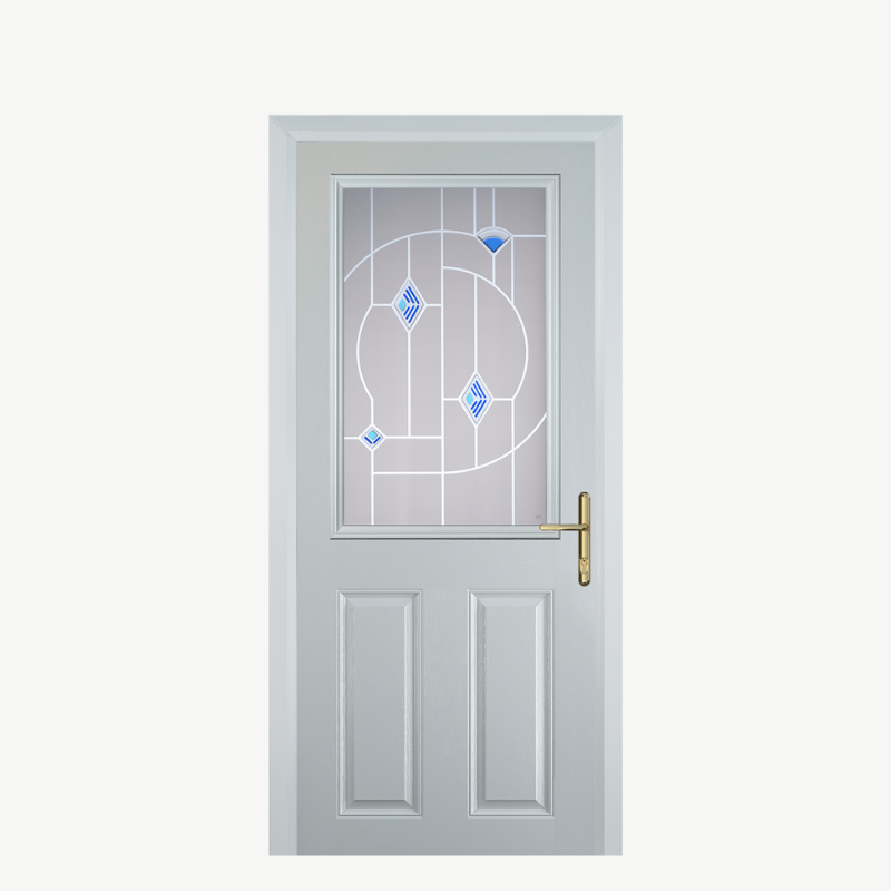Introducing the Door F 2 Panel 1 Square White Murano Blue, a stunning addition to your home that combines style and functionality. This beautifully designed composite front door not only enhances your curb appeal but also provides security and durability.