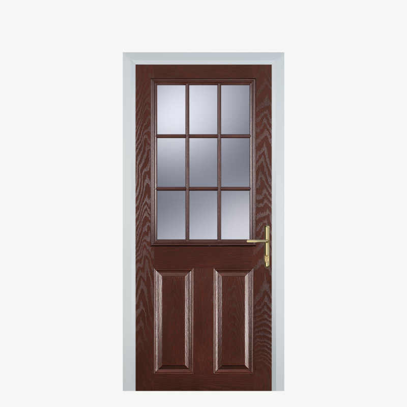 This door serves as a perfect entryway, welcoming guests with its sophisticated appearance while ensuring your home remains secure and energy-efficient. Ideal for both modern and traditional homes, the Door K 2 Panel 1 Grill in Dark Wood offers a unique blend of functionality and style.